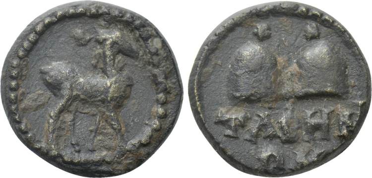 BMC 38 | Tabae, Caria, AE13, semi-autonomous issue. AD 54-68. 1.53 g. Stag standing right. / TABHNΩN, two caps of the Dioskuri, each with a star above. BMC 38. | Text |  |