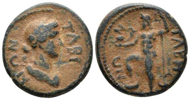 RPC 2872 | Nero, AE19 of Tabae, Caria. AD 54-68. NEΡΩN, laureate head right / TABH-NΩN in two lines within wreath. Two stars above. RPC I 2872; BMC 64-65; SNG von Aulock 2714; SNG Cop 551; Paris 1049; Weber 3189B; Prowe III 1301. | Text |  |