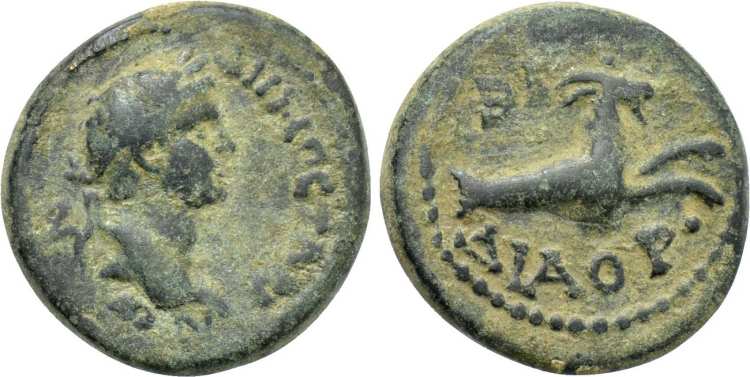 BMC 41-43 | Tabae, Caria. AE17. semi-autonomous issue. 4.24 g. AD 81-96. Magistrate Orthrios Hieron. ΔHMOC TABHNΩN, Laureate head of Demos right. / ΔIO OΡ IE, capricorn right. BMC 41-43; RPC II 1257; SNG Cop 542-543. | Text |  |