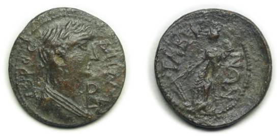 RPC 2871 | Germanicus, with Drusus, Caesar, AE20 of Tabae, Caria. Confronted bare heads of Germanicus & Drusus / TABHNΩN AΘHNAE OΡAΣ ΣE, Legend in four lines within wreath. | Text |  |
