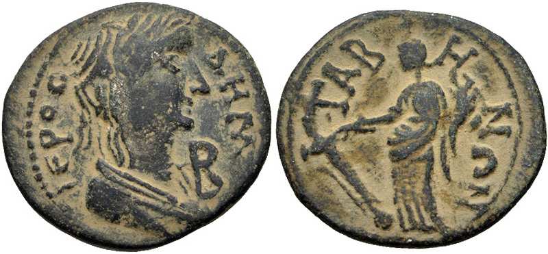 BMC 48-55 | Tabae, Caria, AE23, 5.4 g. Semi-autonomous issue, AD 150-268. IEΡOC ΔHMOC, unbearded, youthful, laureate head of Demos right; value mark B before head. / TABH-NΩN, Tyche standing left, holding rudder and cornucopiae. BMC 48-49; Walcher 2436; SNG Cop. 546-547; SNG Righetti 984; SNG von Aulock 2711; Mionnet III,463; Weber 6583. | Text |  |