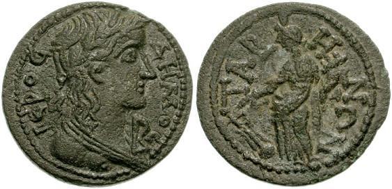 Scholz 65 | Septimius Severus, AE38 of Tabae, Caria. AD 193-211. Magistrate Artemidoros. 28.46 g. AY K Λ CEΠ CEOYHΡOC Π, laureate, draped and cuirassed bust right. / AΡX AΡTEMIΔOΡOY TABHNΩN, Artemis standing right, wearing Phrygian cap, holding bow and reaching for an arrow from the quiver at her shoulder, facing Mên, standing left, wearing Phrygian cap, holding patera and sceptre. Scholz 65 in NZ 1901. | Text |  |