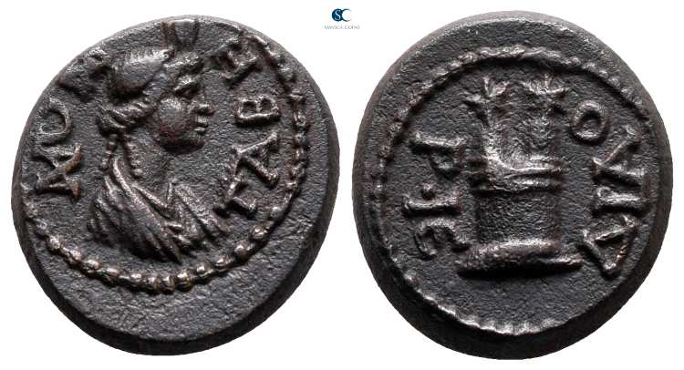 BMC 44 | Tabae, Caria. AE16, semi-autonomous issue, AD 81-96). Magistrate Orthrios Hieron, magistrate. TABHNΩN (anticlockwise from lower right), turreted, draped bust of Tyche right. / ΔIA O-ΡIE (anticlockwise from lower right), garlanded altar surmounted by caps of the Dioskuri. BMC 44; SNG Cop 540-541; RPC II 1258. | Text |  |
