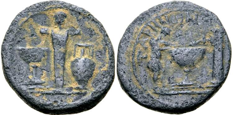 Roma 82, 599 | Tabae, Caria, AE15. 3rd c. AD ?. 3.09 g. Herm between a large basin to left and an amphora to right. / TABHNωN, nude male standing to right, dipping hand into a large basin, column to right. Unpublished types and unpublished legend with ω. Roma 82, 599. | Text |  |