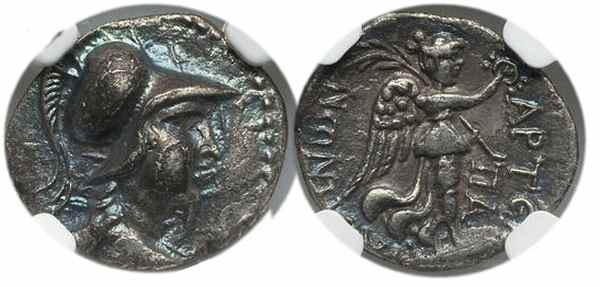 BMC 24 | Tabae, Caria, AR 14mm, hemidrachm, 50 BC-AD 14. Magistrate Attalos. 1.65 g. Helmeted and draped bust of Athena right / ATTAΛOΣ TABHNΩN AΡ, Nike walking right, holding wreath and palm branch. BMC 24; Weber F3184-3185; Waddington 2601; SNG Keckman 267. | Text |  |