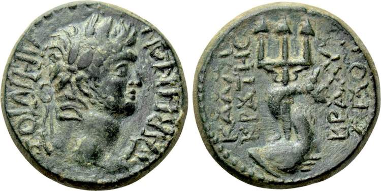 SNG vA 2708 | Tabae, Caria, AE24, semi-autonomous issue. AD 69-96. 9.48 g. ΔHMOΣ TABHNΩN, laureate head of Demos right (resembling Nero). / KAΛΛIKΡATHΣ BΡAXYΛIΔOY, dolphin-entwined trident. SNG von Aulock 2708; RPC II 1249; Imhoof Kar. Münz. 99; Milne 2 in NC 1938; Konsul Weber 3190. | Text |  |