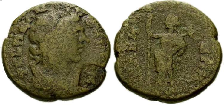 BMC 86 | Caracalla, AE37 of Tabae, Caria. AD 198-217. 31.01 g. Magistrate Artemidorus. AYTOK KAI M AY ANTΩNEINOC, laureate, draped and cuirassed bust right. / AΡX AΡTEMIΔΩΡOY TABHNΩN, Artemis standing right, holding bow and reaching for an arrow from the quiver at her shoulder, facing Mên, standing left, wearing Phrygian cap, holding patera and sceptre. BMC 86; SNG von Aulock 2724; Paris K1160.. | Text |  |