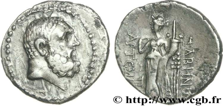 SNG Cop 568 | Valerian I AE 35mm of Tabae, Caria. Iatrokles, archon. AY KAI ΠO ΛI OYAΛEΡIANOC, radiate, draped & cuirassed bust right [c/m: B within incuse circle] / EΠI AΡXON CT IA-TΡOKΛEOYC, TABHNΩN in ex, Artemis standing right, drawing arrow from quiver, & Men standing left, holding patera and sceptre. [c/m: Howgego 766]. | Text |  |