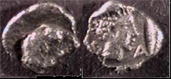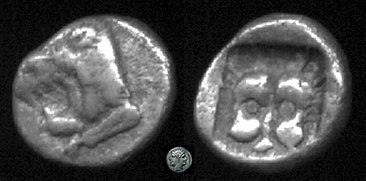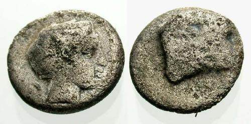 | SNG vA 2338v | Uncertain Carian . Circa 500 BC. AR Diobol. Forepart of lion right / Irregular incuse punch. | Text | Image |