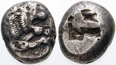 | Rosen 611 | Uncertain Carian . Circa 500 BC. AR Stater. Forepart of a roaring lion right / Incuse punch divided into two halves. | Text | Image |