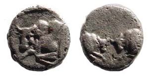 | SNG Keckman 913 | Caria, Uncertain Mint AR Hemiobol. 5th century BC. Foreparts of two bulls facing each other / Forepart of bull left, star below head. | Text | Image |