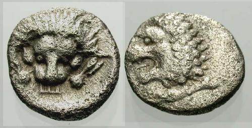 | SNG vA 1819 | Caria, Uncertain Mint AR Hemiobol. 393-377 BC. Lion's head left / Lion's head facing. | Text | Image |