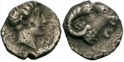 | BMC[Cyprus] 6 | Uncertain, Caria, AR obol, (0.47g) Head of ram right / Bare-headed male head right, A before, all inside of incuse square. | Text | Image |