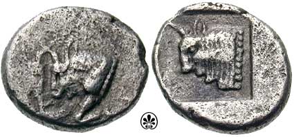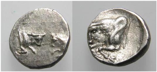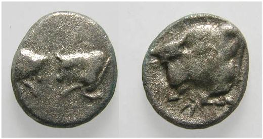 | SNG vA 6669 | Chersonesus? Caria, 387-377 BC. AR Hemiobol 8 mm, 0.40 gr. Foreparts of two bulls facing each other / Forepart of bull left, star below. SNG von Aulock 6669; SNG Keckman 911-912; SNG Tuebingen 3327-3329. | Text | Image |