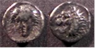 | SNG Lev 217cf | Caria Uncertain Mint AR Tetartemorion. ca 3rd century BC. Facing head of Apollo, slightly left / Lion head left. | Text | Image |