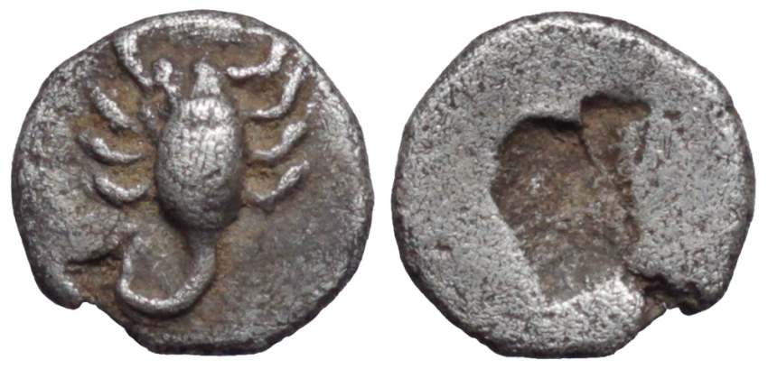 | SNG vA 1817 | Caria, uncertain mint, AR obol. 0.49g, 7.69mm. ca. 450-400 BC. Forepart of lion, seen from above, its paws to left and right of the head / Scorpion within incuse square. SNG Kayhan 934-938, SNG von Aulock 1817; Rosen 403; SNG Keckman 917; SNG Cop 379. | Text | Image |