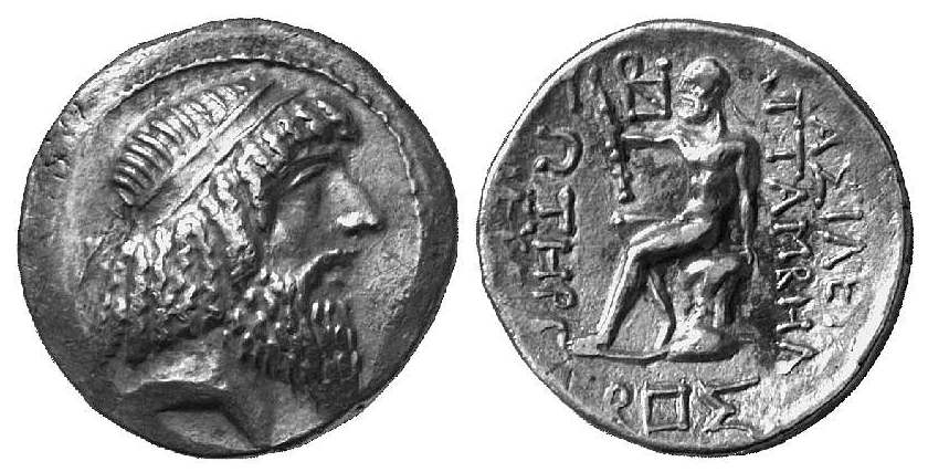 | RSC BMC 1 | Characene, Attambelos I, AR Tetradrachm. Diademed head of king right / BAΣIΛEΩΣ ATTAMBHΛOΣ ΣΩTHΡOΣ KAI EYEΡΓETOY, Herakles seated left on rock. | Text | ![]() |