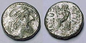 | BMC 1 | Characene, Attambelos I, diademed head of king right / BAΣIΛEΩΣ ATTAMBHΛOΣ ΣΩTHΡOΣ KAI EYEΡΓETOY, Herakles seated left on rock. | Text | ![]() |