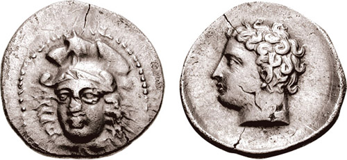 | Brindley_6c | Cilicia, Issos AR Stater. ca 380-370 BC. Head of Athena facing slightly left, in triple-crested Attic helmet / Head of young Herakles(?) left. | Text | Image |