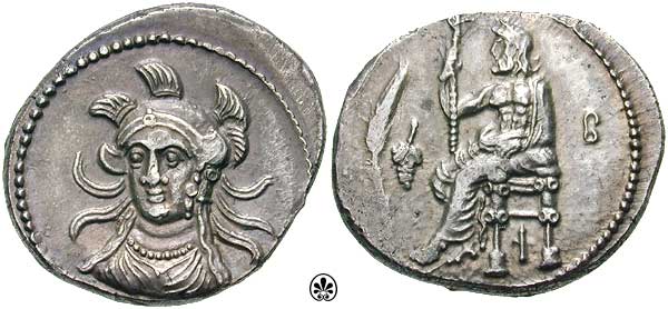 | SNGLev_180 | Cilicia, Issos. Time of Alexander III of Macedonis, 333-323 BC. AR Stater. Draped facing bust of Athena, in triple-crested Attic helmet; I-Σ flanking neck / Baaltars seated left, holding lotus-tipped sceptre; corn-ear and grape bunch to left, I below. SNGFr 419.