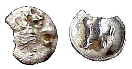 | AIWW1000 | Mallos, Cilicia. 500 BC, 7 mm, 0.2 g. Head of roaring lion right / Astragalos (Knucklebone). AIWW1000.