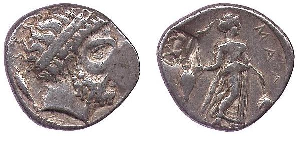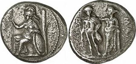 | BMC 26 | Mallos, Cilicia. AR Stater. 10gr, ca. 380 BC. Athena seated left before sprouting olive tree, holding spear and resting left hand on shield / MAΛ, Aphrodite standing left, resting elbow on column, placing right hand on the shoulder of Hermes standing front, on left, holding caduceus. BMC 26; SNG von Aulock 5719; SNG Cop 166; SNG France 2 403; Waddington 4365; Traite 1410, Dewing 2487. | Text | Image |