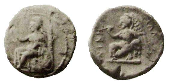| RPC 4017 | Caligula, AE25 of Mallos, Cilicia, 8.8 g. No legend, laureate head left in a border of dots / MA-ΛΛΩ-TΩN in 3 lines to left of Tyche, turreted, sitting right on rock, holding grain-ears, two river gods swimming right and left below. RPC 4017 (Caligula); SNG France II, 1924 (Tiberius). | Text | Image |
