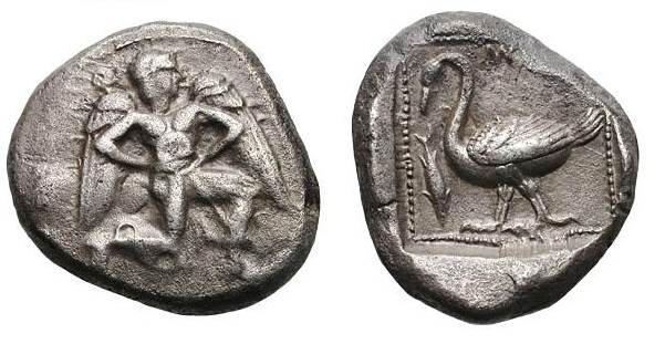 | Imhoof KM 1 | Mallos, Cilicia, AR stater, ca 425-385 BC. 10.72 gm. Kronos, winged, with crested head running right, holding solar disc / M[AΡ], swan standing left, fish downward to left, all within incuse square with dotted border. Imhoof KM 1; Prokesch collection, Berlin. | Text | Image |