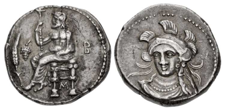 | SNG France 413 | Mallos, Cilicia, AR Stater, under Balakros, ruler of Cilicia under Alexander III, 333-328 BC. Baal seated left, grapes and ear of corn to left, M beneath chair, B in right field. / Draped bust of Athena facing slightly left. SNG France II 413; Paris PA249; Luynes 2864; Traite II-2 724,1. |