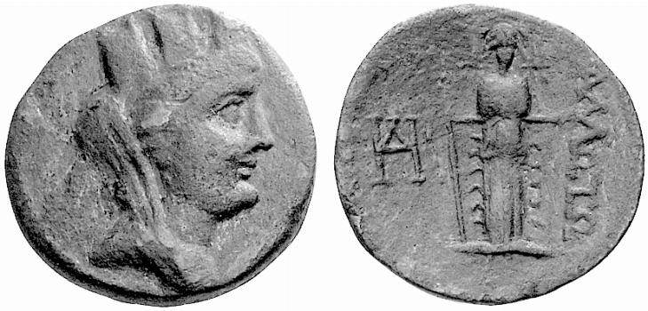 | SNG Lev 1263 | Mallos, Cilicia, AE20 Civic issue, ca 100-1 BC. 4.56 g. Veiled and draped bust of Tyche right. / MAΛΛΩTΩN, cult image of Athena Magarsis facing, wearing serpent-fringed aegis and holding spear and serpent. ΔH monogram in left field. SNG Levante 1263; SNG von Aulock 5722; Righetti Coll Sale 141; Ziegler Kilikien 895-897; Lindgren III 861. | Text | Image |