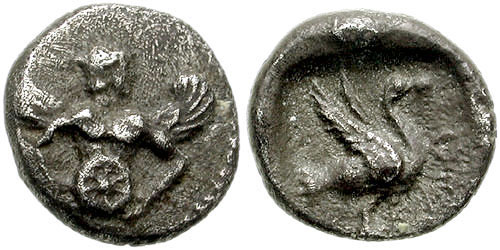 | SNG Lev 166 | Cilicia, Mallos. Circa 385-333 BC. AR Hemiobol. Head of Athena left, in crested Attic helmet / Swan standing right; monogram to right. | Text | Image |