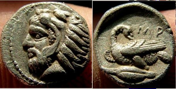 | SNG vA 5720 | Cilicia, Mallos. AR Obol. 425-385 BC. 9mm; 0.9g. Head of Herakles left wearing lion's skin / MA, Swan standing left, head reverted, corn ear below. SNG v. Aulock 5720. | Text | Image |