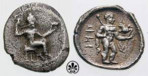 | SNGLev_067v | Cilicia, Tarsos. Tiribazos. 386-380 BC. AR Obol. Baaltars seated right, holding eagle and sceptre / Baaltars(?) nude, standing right, holding eagle and sceptre.