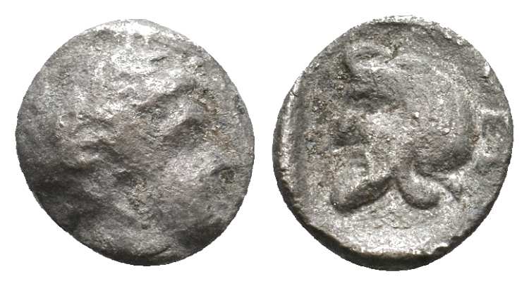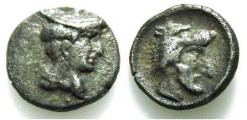 | Göktürk 94 | Cilicia, Uncertain mint. 4th c. BC. AR Trihemitetartemorion, 7.1 mm, 0.35 g. Head of Hermes right, wearing petasos. / Persian male head right, wearing wolf-skin headdress (or head of Herakles right, wearing lionskin headdress). Göktürk 94 in "Small Coins from Cilicia and surroundings"; Troxell & Kagan 19 in "Cilician and Neighbours in Miniature". | Text | Image |