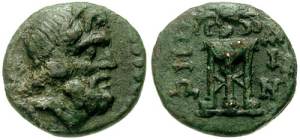 | BMC 11 | Crete, Axos. Circa 2nd-1st Century BC. AE 13mm. Laureate head of Zeus right / Tripod; thunderbolt above. SNG Cop 351. | Text | Image |