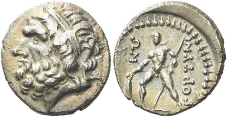 | Sear SG 3186 | Gortyna, Crete, AR Drachm. 2nd-1st century BC, diademed head of Minos or Zeus left / ΓOΡTYNIΩN, naked male figure walking left, head facing, hand on shield, holding spear, wreath in field to left, border of rays. Svoronos 144; BMC 54. | Text | Image |