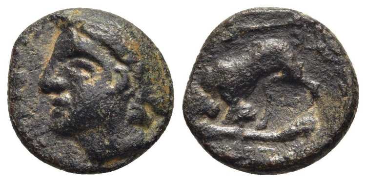 | BMC 74 | Gortyna, Crete, AE12, 2.55 g. ca. 200-67 BC. Laureate head of Apollo right with hair in thick locks down neck, border of dots / ΓOΡ above bull butting right, head facing. BMC 74; SNG Cop 454; Lindgren 1747. | Text | Image |