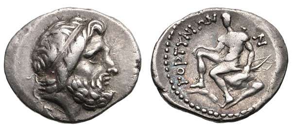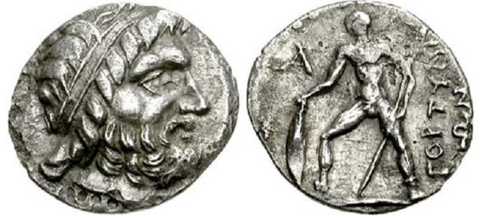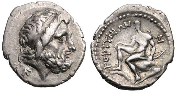 | Price Gortyn 129-148 | Gortyna, Crete, AR drachm, ca. 98-94 BC, 17 mm, 3.14 g. Diademed head of Zeus left. / ΓOΡTINI-ΩN, warrior, naked, standing front, holding shield and spear. (Possibly an overstruck A in upper left field). Price Gortyn hoard, 129-148. (Svoronos 144 var, rev. break). | Text | Image |