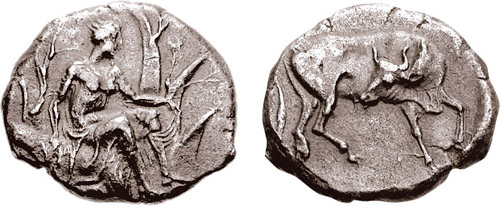 | Svoronos 57 | Gorytos, Crete. AR didrachm, 24 mm. 320-270 BC. No legend, woman sitting right in a pensive attitude in a tree with few leaves, her head in her left hand. / No legend, bull standing left, head turned back. Svoronos 57. | Text | Image |