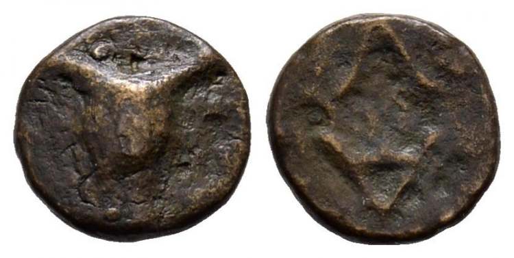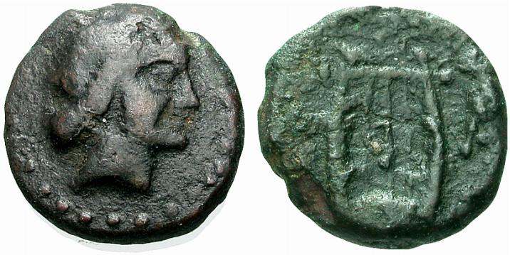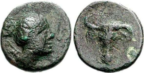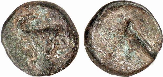 | Svoronos 18 | Lappa, Crete, AE13. ca 200-67 BC. Head of Artemis right, bow and quiver over shoulder. / Bull's head facing. Svoronos 18; Rauch Inédit 6 in Rev. Num. 1860. | Text | Image |