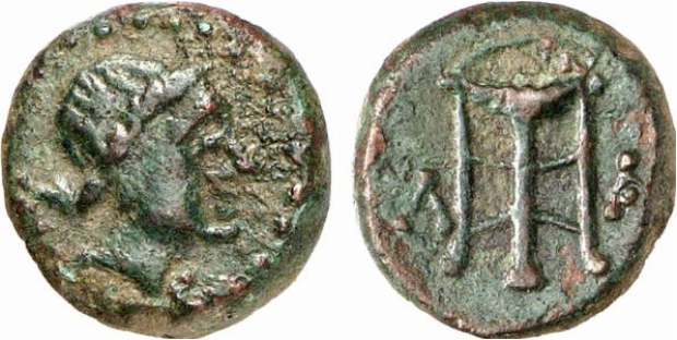 | Svoronos 17 | Lappa, Crete , AE15. ca 200-67 BC. Head of Artemis right, bow and quiver over shoulder. / Λ-A, tripod. Svoronos 17; SNG Cop 482. | Text | Image |