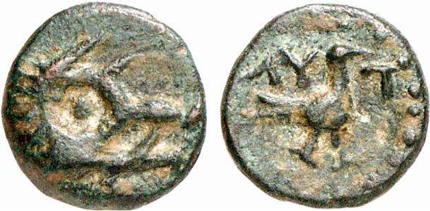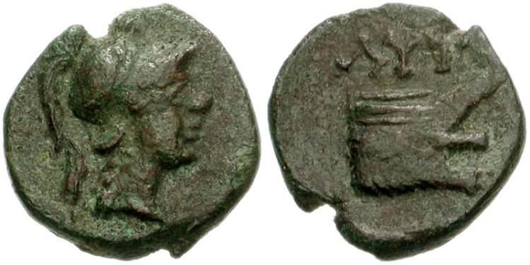 | BMC 21 | Lyttos, Crete, AE12, ca 350-270 BC. 1.24 g. Helmeted head of Athena right. / ΛYT, prow. Svoronos 87; SNG Cop 506-507; Mionnet II, 229; BMC 21-22. | Text | Image |