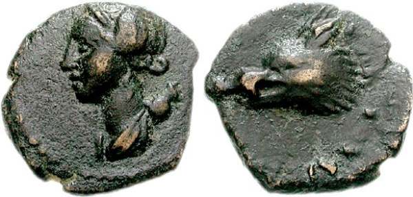 | CNG 76, 625 | Lyttos, Crete (?), AE15, ca 350-270 BC. 3.10 g. Draped bust of Artemis left, bow and quiver behind shoulder. / ΛYT, boar's head left. Not in Svoronos, Wroth, BMC, SNG Cop etc. CNG 76, 625. | Text | Image |