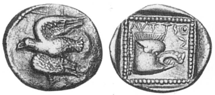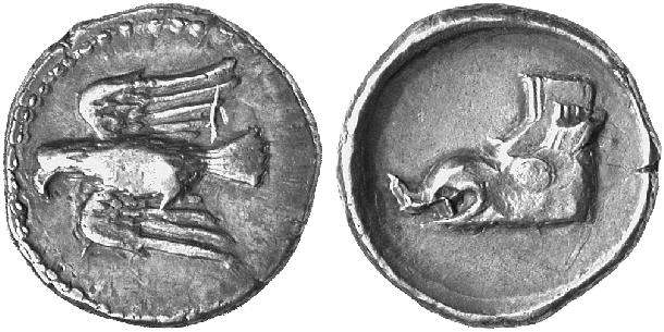 | Svoronos 58 | Lyttos, Crete, AR Stater, ca 320-270 BC. 10.55 g. Eagle flying right, almost upright, carrying prey in its claws. / ΛYT-TION (retrograde), boar's head left within dotted incuse square. Svoronos 58; Le Rider, Monn. Crét. 221. | Text | Image |