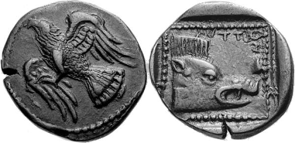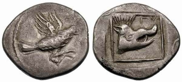 | Svoronos 56 | Crete, Lyttus AR Stater. 330–300 BC. Eagle flying right, hare in claws / ΛV, boar's head right in shallow incuse square with linear square border. | Text | Image |