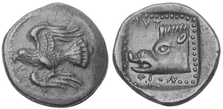 | Svoronos 19 | Lyttos, Crete, AR drachm, ca 320-270 BC. 5.28 g. Eagle flying left. / ΛYTTION, boar's head right within dotted square. Svoronos 19 (this coin). | Text | Image |