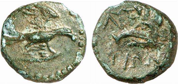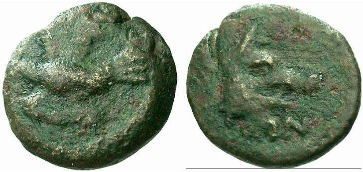 | BMC 31 | Lyttos, Crete, AE15, ca 350-270 BC. 1.38 g. Boar’s head right. / ΛYT, eagle standing right. Svoronos 83-84; Berlin 28686; BMC 31-32. | Text | Image |