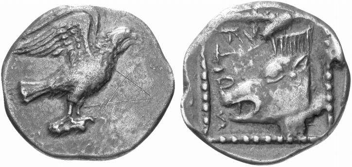 | Svoronos 31 | Lyttos, Crete, AR Stater, ca 320-270 BC. 11.18 g. Eagle flying left. / ΛYT-TION, boar's head right within dotted incuse square. Svoronos 31. | Text | Image |