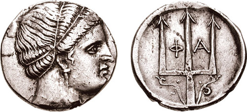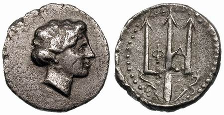 | Svoronos 5 | Crete, Phalasarna AR Drachm. ca 300–280 BC. Head of nymph right, in pendant earring & band around head / Φ-A, trident head ornamented with vegetative tendrils.
