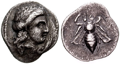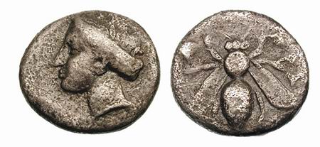 | Svoronos 45 | Crete, Praesus AR Hemidrachm. ca 330–300 BC. Head of Kore-Persephone left, wreathed with grain leaves / ΠΡAI, bee, rose bud to left.